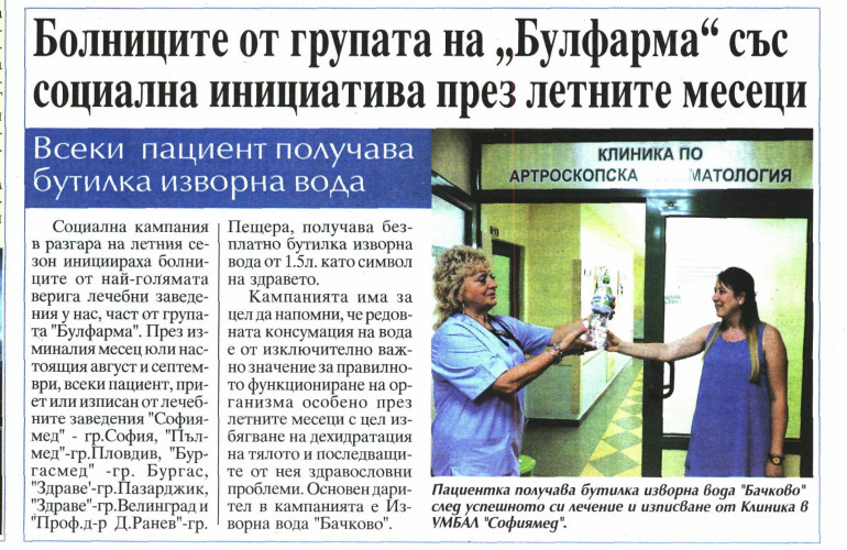 Социална кампания в разгара на летния сезон инициираха болниците от най-голямата верига лечебни заведения у нас, част от групата "Булфарма". През изминалия месец юли настоящия август и септември, всеки пациент, приет или изписан от лечебните заведения "Софиямед" - гр.София, "Пълмед"-гр.Пловдив, "Бургасмед" -гр. Бургас, "Здраве'-гр.Пазарджик, "Здраве"-гр.Велинград и "Проф.д-р Д.Ранев"-гр. Пещера, получава безплатно бутилка изворна вода от 1.5л. като символ на здравето.