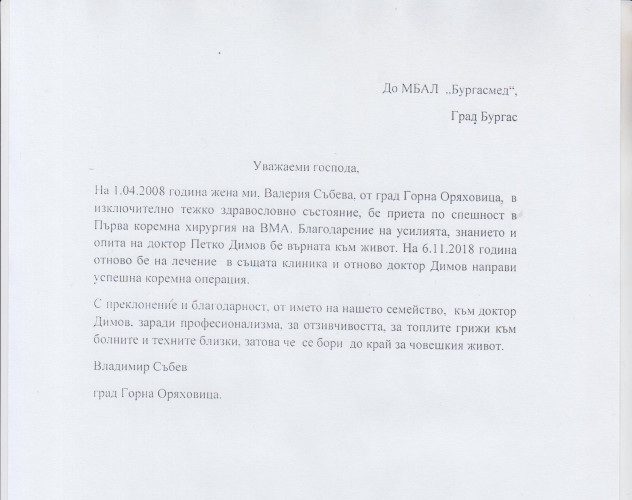 Тези думи на благодарност към професионализма на д-р Димов изпраща г-н Владимир Събев от Горна Оряховица, веднага щом разбира, че д-р Димов е поел хирургичното отделение в болница "Бургасмед".