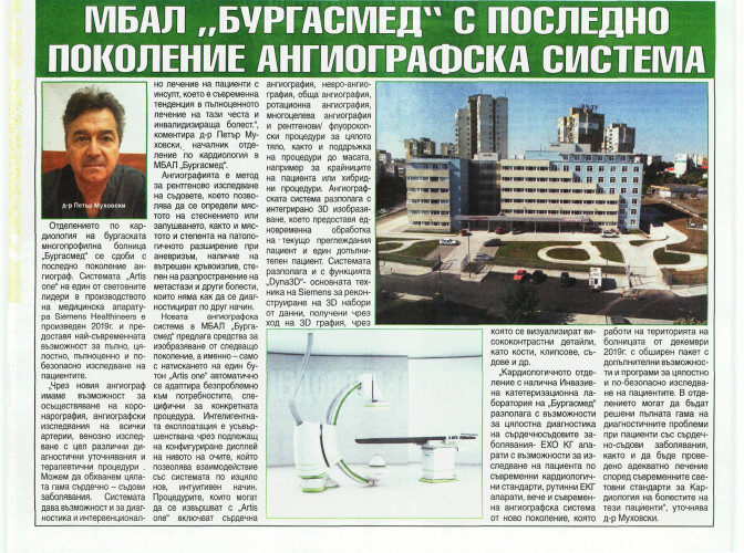 Отделението по кардиология на бургаската многопрофилна болница „Бургасмед“ се сдоби с последно поколение ангиограф. Системата „Artis one“ на един от световните лидери в производството на медицинска апаратура Siemens Healthineers е произведен 2019г. и предоставя най-съвременната възможност за пълно, цялостно, пълноценно и по-безопасно изследване на пациентите.
